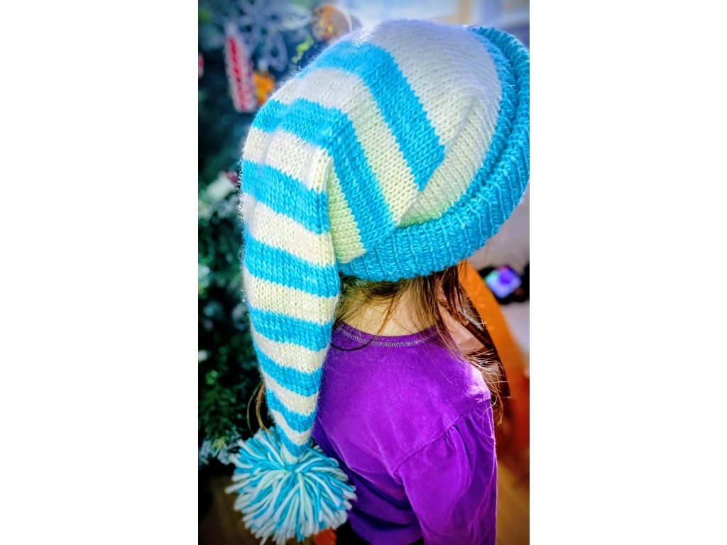 Dětská čepice skřítek je ručně pletená, barvená z jemňoučké merino vlny.